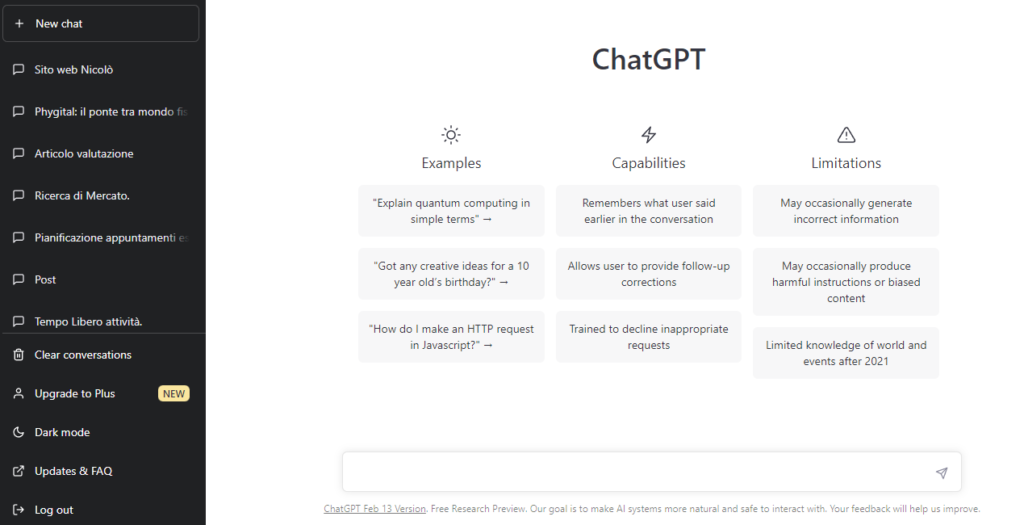 Inoltre ChatGPT 3 è in versione gratuita da gennaio 2023, con cui puoi interagire collegandoti direttamente qui https://openai.com/blog/chatgpt/.
